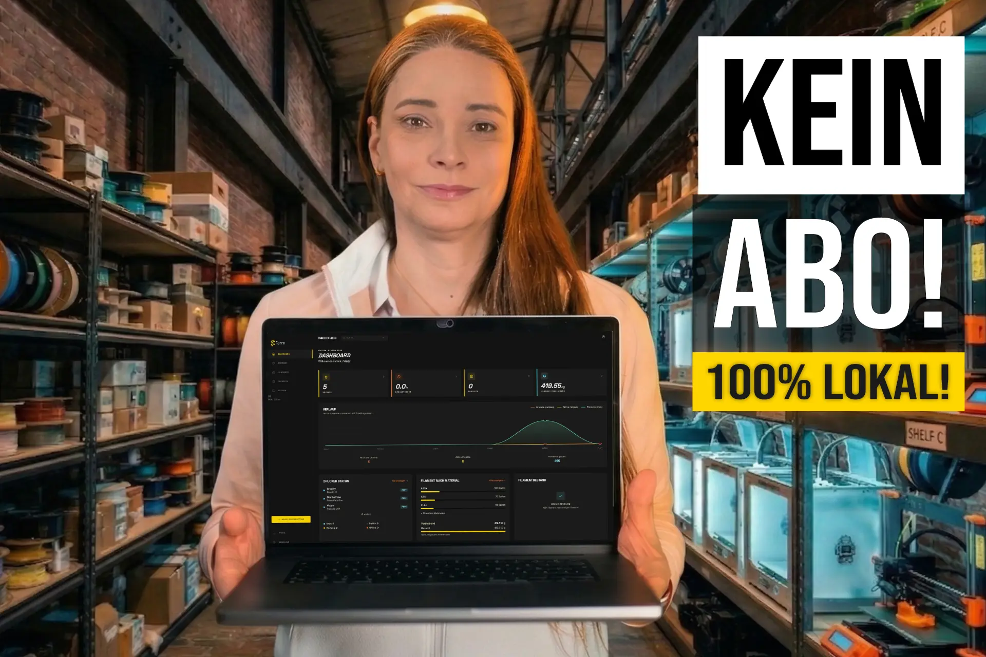 Verwalte deine 3D-Druckfarm lokal, ohne Cloud-Zwang und ohne monatliche Abo-Kosten. Drucker, Filamente, Projekte und Kosten — alles in einem Dashboard.